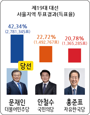 이번 대선에서 서울 지역의 민심이 당선자를 결정했다는 평가가 많습니다. 이런 평가가 나오는 이유는 유권자 수가 많기 때문이기도 하지만, 서울에는 전국 각지의 사람들이 모여 있어 특정정당 쏠림 현상 없이 후보자와 공약을 보고 투표 하는 경향이 강하다는 이유도 있습니다.