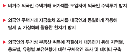 외국인 투기성 부동산 취득 규제를 한다고 합니다. 그동안 투기 방지의 대상은 다주택자에 집중되어 있었는데 그 대상을 외국인으로 특정한 부분이 흥미롭습니다.
