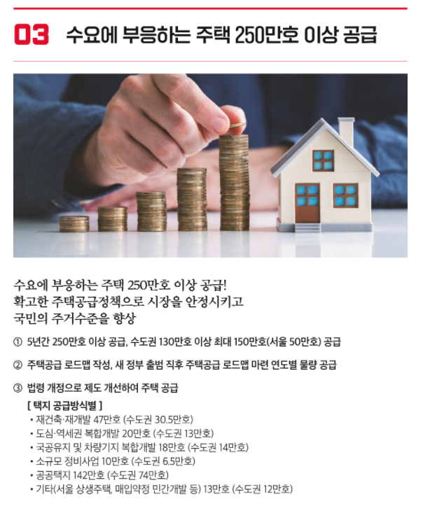 250만호 이상 주택 공급은 윤석열 당선인의 10대 비전에도 포함이 되어 있는 내용으로, 임기 내 비중있게 다루어질 공약으로 보입니다. 서울 50만호를 포함한 수도권 150만호 이상, 전국 250만호 이상의 주택을 공급하겠다는 내용입니다. 부동산 공급물량에 관한 내용은 지난 몇 년 동안 부동산 시장을 시끄럽게 했던 이슈 중 하나인만큼 단순한 숫자놀이가 아닌 대다수의 국민들이 인정할 수 있는 만족할 만한 내용의 공급 정책이 이루어지길 기대해 봅니다.