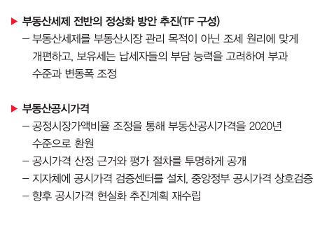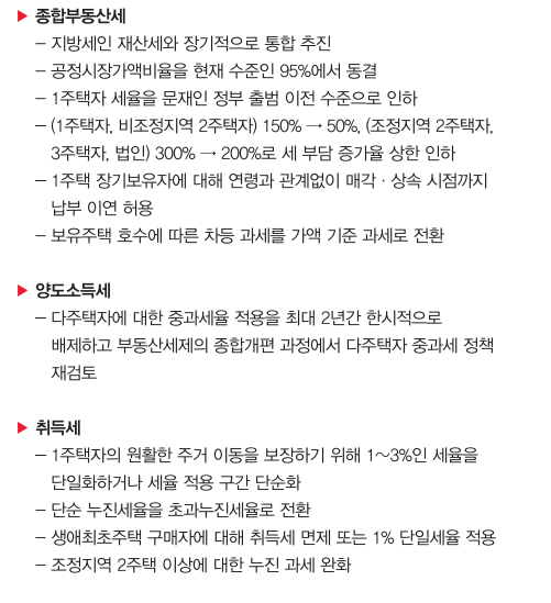 현행법령은 부동산을 취득할 때 취득세, 보유할 때는 재산세와 종합부동산세, 처분할때는 양도소득세를 내도록 되어 있습니다. 재산세와 종합부동세/재산세와 양도소득세 간에 이중부과 논란이 있어왔는데, 불로소득을 차단한다는 목적 외에도 부당하게 이중으로 세금을 내는 상황들이 발생하지 않도록 합리적인 개선이 이루어졌으면 합니다.