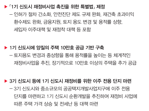 수도권 1기 신도시(분당, 일산, 평촌, 산본, 중동)은 첫 입주가 시작된 지 30년이 지나면서 노후화되고 층간소음, 주차시설 부족 등 이웃간의 갈등 또한 심화되고 있는 실정입니다. 1기 신도시 재정비를 위한 특별법을 제정해 절차를 간소화하고 용적률도 상향하는 대책도 검토한다고 합니다.