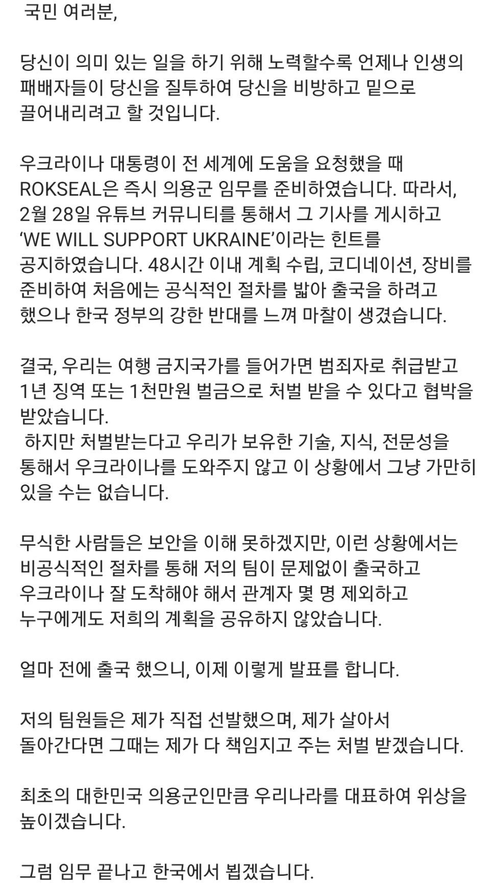 그는 "팀원들은 제가 직접 선발했으며, 살아서 돌아간다면 제가 다 책임지고 처벌 받겠다"며 "최초의 대한민국 의용군으로 우리나라의 위상을 높이겠다. 임무 끝나고 한국에서 뵙겠다"고 말했다.
