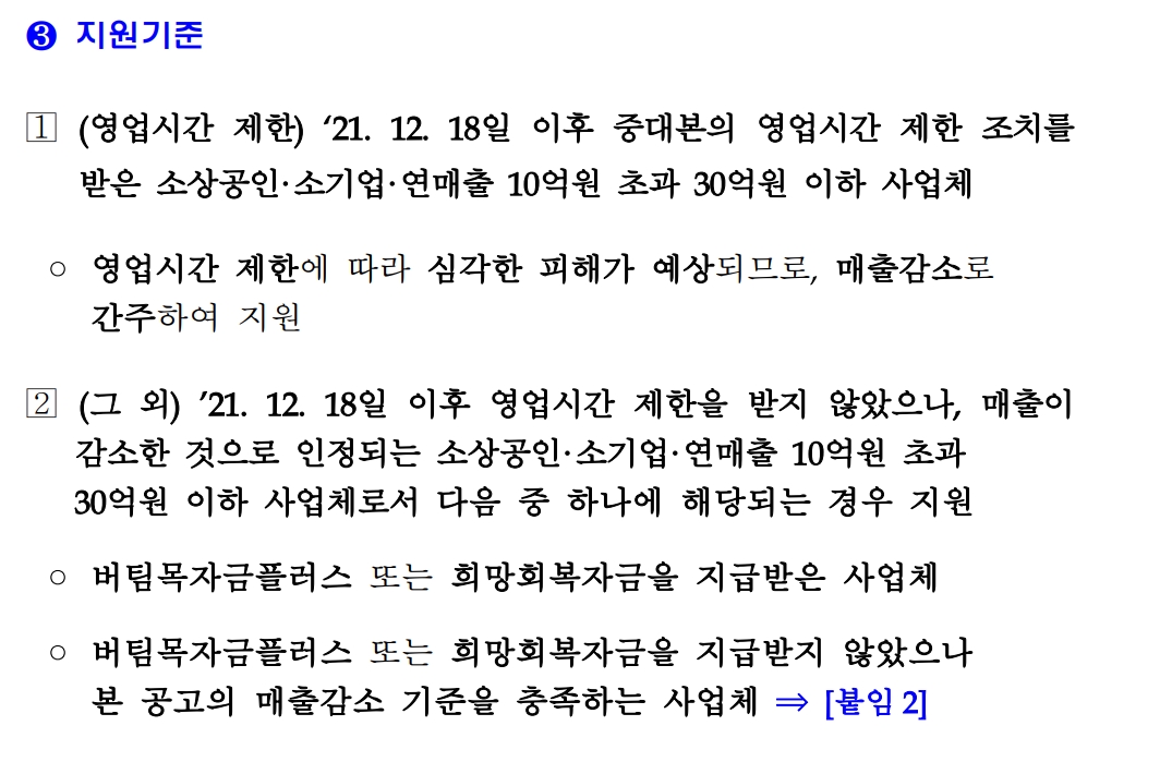 ③ 소상공인 or 소기업 or 연매출 10억 초과 30억 이하 국세청에 사업자 등록된 사업체