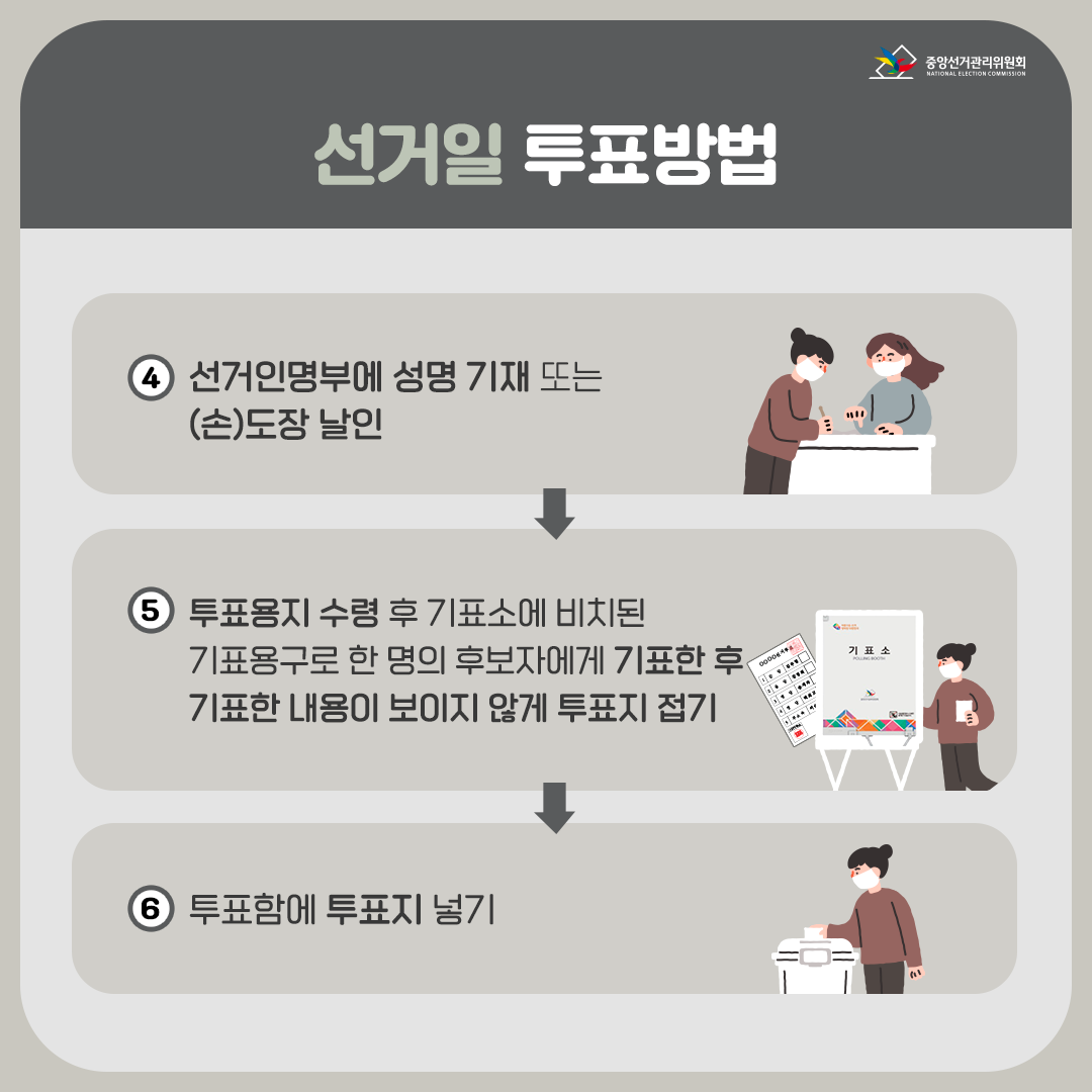 ①선거인명부 확인 → ②투표용지 교부 → ③기표소 기표 → ④투표함 직접 투입