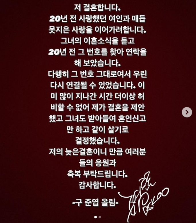 구준엽은 최근 본인의 인스타그램에서 20년전 연인이었던 서휘원의 이혼소식을 듣고 20년 전 번호로 연락을 했고, 다시 연결될 수 있었다고 합니다.